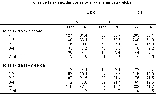 Em consonância com o tempo dedicado à televisão verifica-se ainda uma grande disponibilidade deste meio, visível no número médio de 2.79 televisores por casa (Moda=2) e ainda no facto de 42% dos participantes terem acesso à TV por cabo. A estes dados, acrescente-se que 44,4% das crianças e dos adolescentes da amostra possuem televisão no quarto. No que se refere ao contexto de exposição à televisão, pretendeu-se conhecer a frequência da mediação parental. No Quadro 2 apresentam-se as estatísticas descritivas relativas ao tipo de mediação (co-exposição, mediação restritiva e mediação avaliativa5) exercido pelos pais. Estatísticas descritivas da mediação da televisão pelos pais