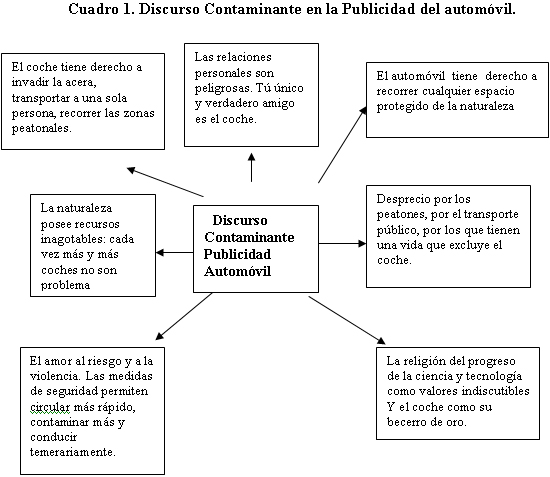 5.2 Análisis connotativo Desde la publicidad televisiva de los automóviles, con fines comerciales, se promueven: - Valores y comportamientos irrespetuosos con los espacios destinados a peatones y ciclistas, potenciando un uso abusivo y poco racional del vehículo privado motorizado. - Modalidades de conducción peligrosas. - Falta de respeto hacia el uso del transporte público. - Indiferencia ante los recursos limitados de la naturaleza. - Falta de respeto ante la invasiónpor el vehículo motorizado privado de espacios naturales protegidos, promocionando en muchos casos la circulación por los mismos. - Valores de insolidaridad al potenciar un sentimiento de superioridad respecto de usuarios que no utilizan los vehículos a motor privados. El análisis connotativo de la narración de los spots de los automóviles produce grandes frutos en cuanto a la movilidad insostenible que promueven en el espectador televisivo, se incluyen algunos ejemplos. «Elegancia y tecnología son un derecho, no un privilegio» (Campaña Opel Astra Sedán). Un derecho más del ser humano es «poseerun coche con la máxima tecnología, calidad, seguridad, confort y elegancia al alcance de todo el mundo». Las empresas de automóviles se apuntan en el mismo año de la celebración del 50 Aniversario de la Declaración de Derechos Humanos, planteando el derecho inalienable que cada ser humano tienea poseer un coche. Otras campañas aspiran a alcanzar un techo más alto: Cada individuo debe tener dos vehículos. «¿Qué necesita un hombre que tiene ya un gran coche? Otro. Otro coche con idéntico nivel de sofisticación que los grandes coches. O más» (Volswagen Lupo). Este modelo de «cada persona un coche, por lo menos» es inasumible dado que el transporte es una de las causas principales de la producción de CO2 y por tanto del Cambio Climático. Por otra parte, España es, por tradición un país ruidoso, el que más en Europa, según la Organización Mundial de la Salud, y el segundo en el mundo después de Japón. En los últimos años, la situación no ha mejorado, sino que el espectacular aumento del parque automovilístico y una deficiente planificación urbanística y de los servicios públicos de transporte han agravado el problema. No se ha encontrado ningún anuncio de coches que pontifique el derecho del ciudadanoa la ausencia decontaminación acústica, a cierto silencio. El discurso de las medidas deseguridad en el automóvil se promueve en el espectador televisivo como algo que permite ir al conductor más rápido, sorteando los peligros más inverosímiles e incluso fomentando la conducción temeraria. Coches cada vez más potentes y seguros, casi «carros de combate», que permiten jugar con los peligros de la velocidad en condiciones más ventajosas. Un blindaje, que también en este caso es mayor o menor en función de los niveles de renta. Siempre tiene más posibilidades de sobrevivir a un accidente de tráfico un alto ejecutivo al volante de un 4x4, que un vendedor ambulante que conduce una desvencijada furgoneta. Anuncio televisivo del Renault Megane y el control policial: El automóvil puede chocar con los policías, excusa del espejismo, pero gracias a la seguridad del coche, airbags y frenos, al conductor no le pasará nada. Anuncio televisivo de Renault y ciclista por carretera: Un ciclista tiene que estar agradecido a un conductor, pues circulando el automóvil por carretera a gran velocidad gracias a sus frenos no atropella al ciclista. Mensaje: desprecio por la vida de los peatones, ciclistas e incluso otros automovilistas. |