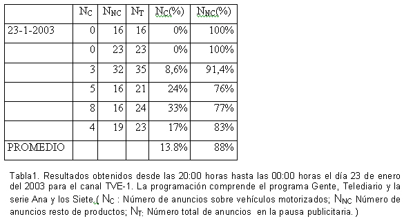 La retransmisión de la Formula-1 es un continuo publicitario, de forma que los spot de los intermedios constituyen un refuerzo de la numerosa publicidad presente durante el espectáculo deportivo: vallas con letras descomunales, coches forrados de marcas, pilotos-anuncio, pancartas, etc. Prácticamente el espectador no cesa de recibirmensajes publicitarios sobre vehículos motorizados durante las dos horas que dura el espectáculo. Los spots de las pausas presentan un ritmo vertiginoso con cambios constantes de planos y una narración sincopada. Centrando el estudio en anuncios de vehículos motorizados y analizado de una forma especifica una muestra de 252 anuncios de coches grabados de la televisión desde el año 2000 al año 2005. Como primer resultado es de destacar el número elevado de anuncios de televisión donde se potencia y promueve en el espectador una conducción temeraria y arriesgada. Excluyendo de la muestra aquellos anuncios que no transcurren en un entorno real, por ejemplo hay un anuncio de una marca alemana que transcurre en una exposición de pintura contemporánea, en el 30% de los anuncios analizados se presenta una conducción peligrosa, agresiva o inapropiada. Como conducción inapropiada, aparecen coches aparcados en la acera, coches circulando por zonas peatonales o incluso moviéndose por el interior de un piso. Como conducción agresiva se muestran coches a gran velocidad, acompañados de música muy dinámica y de sonidos asociados a alta velocidad. Como conducción peligrosa o arriesgada se nos muestran vehículos todoterreno atravesando ríos o caminos en mal estado a gran velocidad o dando saltos. Sin embargo, la Norma Segunda del Código de Conducta Publicitaria establece que la publicidad debe respetar la legalidad vigente y de manera especial los valores, derechos y principios reconocidos en la Constitución. Asimismo, la Norma Séptima del Código citado establece que la publicidad no incitará a comportamientos ilegales. El artículo 52 de la ley 19/2001 de 19 de diciembre, de reforma del Texto articulado de la Ley sobre Tráfico, Circulación de Vehículos a Motor y Seguridad Vial prohibe que la publicidad de vehículos a motor ofrezca imágenes «que ofrezca en su argumentación verbal, en sus elementos sonoros o en sus imágenes, incitación a la velocidad excesiva, a la conducción temeraria, a situaciones de peligro o cualquier otra circunstancia que suponga una conducta contraria los principios de esta ley». Desde julio de 1996 hasta marzo del 2004, el jurado de expertos de Autocontrol sólo ha condenado 16 anuncios por explotación de miedo, incitación a la violencia o cuestiones relacionadas con el respeto al buen gusto (De Sandoval, 2004, p.32). Frente al mensaje que desde las autoridades municipales se recomienda de usar el vehículo privado lo imprescindible para desplazarse en las ciudades, desde la publicidad televisiva se potencia en el espectador lo contrario. El 58% de los anuncios incluyen un automóvil moviéndose por zonas urbanas e incluso por cascos históricos de ciudades muy conocidas. Únicamente el 33% de los anuncios muestran coches desplazándose por carreteras, que debía ser el ámbito natural de estas máquinas. Otra obsesión de los publicistas y de las marcas es demostrar al espectador lo fácil que es aparcar en las modernas ciudades, en el 38% de los anuncios analizados aparecen los automóviles aparcando sin problemas. Normalmente el conductor posee cochera o tiene el coche aparcado en la mismísima puerta de su casa. Si se mueve por el casco de una ciudad no aparece ningún coche aparcado y el conductor puede situar su automóvil en el sitio mismo donde desea acceder. Es habitual que el escenario del spot donde se nos presenta el vehículo sea un aparcamiento muy amplio con las líneas de separación bien definidas. En cuanto al tipo de personas protagonistas de los anuncios de coches. Únicamente en el 2.2% de los anuncios conduce una persona mayor. El coche, con espacio para 4ó 5 plazas como mínimo, solamente es ocupado por un grupo o familia en el 4,4% de los casos. El 53% de los anuncios de coche es protagonizado por hombres y el 29% por mujeres. De éste 29%, en gran parte de los mismos la mujer es recogida por el hombre conductor o contempla el coche en un concesionario sin llegar a conducir; de forma que en el 50% de los anuncios que aparece una mujer su papel es pasivo en cuanto a conducir. El sector del automóvil ha sido el más denunciado en el año 2000 por su publicidad sexista, con el 14,42 por ciento del total de las 339 denuncias recibidas en el Observatorio de la Publicidad del Instituto de la Mujer. Los niños aparecen en un 6,7% de los anuncios; el planteamiento de muchos de ellos es el del coche como proyecto vital: el niño gatea, anda, crece y se mueve en bici, después utiliza la motocicleta, para finalmente llegar a la madurez vital con el uso del automóvil. Otro parámetro que se ha determinado ha sido el número de personas que se desplazan en el automóvil. Únicamente hay más de 2 personas en el coche en el 9% de los anuncios, mientras en el 43% de los mismos los conduce una sola persona. En unos tiempos donde desde la Administración se aconseja el coche compartido como medida de ahorro energético y para disminuir la contaminación y congestión en las ciudades, desde la publicidad televisiva se promueve el enorme derroche de conducir cada coche por una sola persona. Son frecuentes los escenarios en los spots de aparición de varios coches a la vez en el cuadro, siendo todos ellos conducidos por una sola persona. Se incluye el modelo de ficha a rellenar para cada spot publicitario, ver tabla 3.