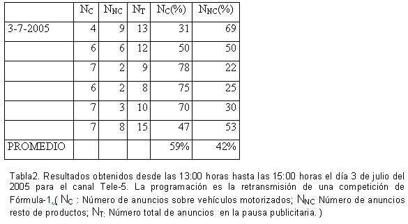 La frecuencia de los anuncios sobre vehículos motorizados cambia bastante respecto a los valores anteriores si nos centramos en la retransmisión de las pruebas de Fórmula 1 de automovilismo. En la tabla 2 se muestran los resultados obtenidos para esta retransmisión deportiva. Destaca la aparición de picos de hasta el 78% de anuncios dedicados al automóvil, con un promedio del 59%. Muy superiores estos porcentajes a los encontrados en una programación normal nocturna en horario de máxima audiencia. Las pausas publicitarias son escasas, cada media hora aproximadamente y contienen un número de anuncios total mucho menor. En retransmisiones deportivas de gran audiencia, donde las pausas publicitarias son cortas (Tour de Francia, Roland Garros, Wimblendon, etc.) también acontecen estos porcentajes de frecuencias muy elevados de anuncios sobre vehículos motorizados.