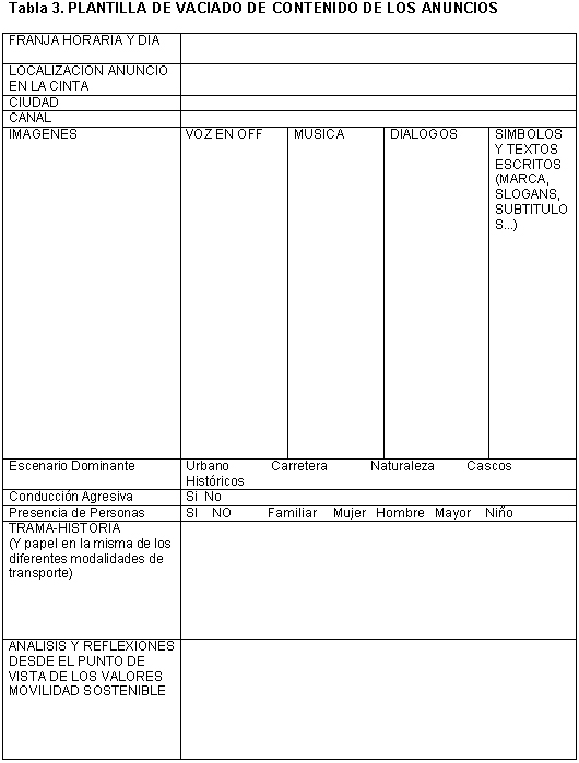 2. Observatorio de la publicidad de la movilidad sostenible El modelo de movilidad dominante, asociado a un alto consumo de energía (el transporte es el mayor consumidor de energía en los países desarrollados; más de un cuarto del total de energía producida y más del 60% del petróleo son consumidos directamente por este sector), a un alto grado de contaminación (el transporte es una de las causas principales de la producción de CO2 y por tanto del Cambio Climático) y a una permanente congestión del tráfico en las ciudades y carreteras, está demostrando su insostenibilidad y la necesidad de un cambio radical. El uso abusivo del vehículo privado motorizado es el mayor responsable de esta situación, y en todos los estudios se revela como uno de los medios de transporte más ineficientes, tanto desde un punto de vista energético como de ocupación de espacio público, a la vez que genera una mayor tasa de contaminación y de coste social. No obstante, debido a la presión comercial de las diferentes marcas de coches, la obsesión por este «objeto de deseo» no hace más que crecer, de la mano de una acción publicitaria sin precedentes y que no repara en gastos. Las compañías fabricantes tienen, por tanto, una responsabilidad social en lo que se refiere a la exaltación y mantenimiento de determinados comportamientos contrarios a la racionalidad en el uso de los vehículos a motor y a los criterios de movilidad sostenible. Los contenidos de los anuncios publicitarios tendrían que ser analizados para poder, en cada caso, ensalzar o reprochar públicamente los valores y comportamientos que estén promocionando. De la misma manera que existen ya Observatorios de la Publicidad relacionados con temas de Género o de Inmigración, creemos que un tema de tanta trascendencia para la calidad de vida de la población y para la preservación del medio ambiente urbano y natural, como es el de la Movilidad, necesita un Observatorio específico. La función del Observatorio de la Publicidad de la Movilidad Sostenible es la de hacer un seguimiento de los medios de la televisión, recoger la publicidad y otras informaciones que hagan referencia a la movilidad, analizarlas y reflexionar sobre ellas, promoviendo diferentes iniciativas que favorezcan una actitud crítica de los ciudadanos y un cambio positivo hacia la movilidad sostenible. 3. Objetivos del Observatorio 3.1 Objetivos Generales Conseguir cambios en las pautas de movilidad de la ciudadanía hacia formas más sostenibles de movilidad. Sensibilizar a la población y a los anunciantes sobre los valores y comportamientos relacionados con la movilidad que se difunden a través de la publicidad. Reflexionar sobre los efectos que la publicidad televisiva produce en las actitudes de la ciudadanía hacia la Movilidad Sostenible. Incidir en la promoción del transporte sostenible, normalización de los medios alternativos de transporte y disuasión del uso abusivo del coche en numerosos colectivos ciudadanos: colectivos de estudiantes, publicistas, asociaciones de consumidores, cargos políticos, técnicos, medios de comunicación, fabricantes de automóviles, etc. 3.2. Objetivos específicos Identificar -en la comunicación comercial televisiva de los vehículos privados motorizados- cuáles son los valores ambientales y de consumo que se potencian, las estratagemas persuasivas que se ponen en marcha y los usos del vehículo que se prescriben, así como la imagen que se potencia de las otras modalidades de transporte: caminar, bicicleta y transporte público y/o colectivo. Poner en contacto los valores y contravalores de la publicidad con hábitos de movilidad en la vida cotidiana. Identificar, en iniciativas cívicas, sociales y políticas relacionadas con la movilidad,cuál es el discurso que se va construyendo sobre la movilidad sostenible, los puntos de consenso y de disenso entre las diferentes propuestas y posicionamientos. Elaborar materiales de intervención que utilicen la publicidad y la comunicación como elementos de reflexión y dinamización. Interactuar con otros Observatorios de la publicidad televisiva. Colaborar con instituciones públicas en campañas sobre movilidad sostenible. 4. Metodología La puesta en marcha del Observatorio de la Publicidad de la Movilidad Sostenible(OPMS) y la elaboración de materiales de Educación requiere de una primera fase que, a partir de la recopilación, selección y estudio de una muestra de anuncios representativa de la publicidad emitida en televisión, nos permita disponer de un material de base sobre el que reflexionar, así como estudiar iniciativas y prioridades de acción, diseñar las líneas de actuación estratégicas y establecer los requerimientos de comunicación y logística para el mantenimiento en el tiempo del Observatorio. Existen dos niveles en la lectura de imágenes: el nivel denotativo y el nivel connotativo. El nivel denotativo u objetivo se refiere a una enumeración y descripción de objetos, cosas y/o personas que aparecen: tipo de plano, iluminación, color, relación de los personajes, etc. El análisis connotativo o lectura subjetiva nos permite analizar los mensajes ocultos que subyacen en una imagen: de qué manera aparece disfrazada la información, qué valores transmite, qué elementos -fragmentos de paisajes, de personas o de escenarios- cobran significación, etc. Para detectar aquellos aspectos que impliquen en la publicidad concepcionesligadas con un modelo de movilidad sostenible o insostenible, recurriremos tanto al análisis objetivo como al análisis connotativo o lectura subjetiva. Ejemplos de la aplicación de este tipo de análisis pueden consultarse en Sainz (Sainz, 2002). 5. Resultados La función del Observatorio es la de hacer un seguimiento de la televisión, realizando grabaciones periódicas: Recogida en horario prime time de los anuncios donde se hace referencia a los diferentes medios de transporte, especialmente a los vehículos