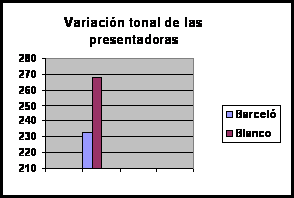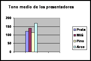 -Puesto que el tono de voz más grave se percibe como más seguro y creíble, podemos concluir que la voz de Hilario Pino y la de Angels Barceló son las que obtienen en mayor medida estas percepciones del telespectador. -La expresión más dinámica en cuanto al tono la consiguen Lorenzo Milá, Roberto Arce y Ana Blanco, que, empleando una mayor variedad tonal, favorecen el contraste acústico y semántico de la información y, con ello, la atención del oyente. -En general, los presentadores de televisión entonan bastante bien produciendo cambios melódicos en el mensaje. Sin embargo, la curva más natural con variaciones producidas de forma paulatina la consiguen Lorenzo Milá y Roberto Arce. Ambos presentadores tienen una entonación muy agradable al oído, con lo que se favorece la comprensión de la audiencia. En cambio, Matías Prats produce el típico cántico de informativos elevando el tono de manera artificial y brusca en las penúltimas sílabas del grupo fónico. Esa regularidad provoca que su expresión se oiga muy poco natural. Por último, Hilario Pino produce bruscas bajadas de tono al final del mensaje que limitan la percepción de la parte fundamental del discurso. -Las presentadoras de televisión, en general, entonan de forma correcta aunque producen bruscas elevaciones de tono, especialmente Angels Barceló, que se perciben como poco naturales. |