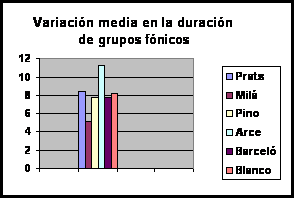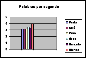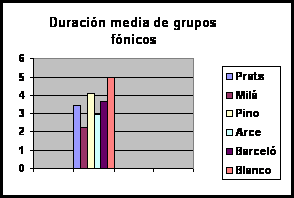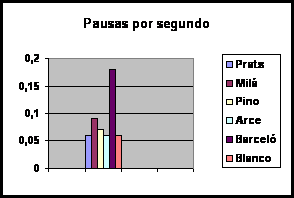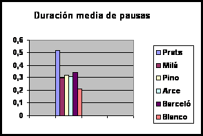 La duración de la voz es la cualidad que permite fragmentar el discurso a través de la unión en grupos fónicos a los que se imprime una determinada velocidad junto con la combinación de las pausas. Por tanto, es un elemento esencial para dotar de ritmo al discurso. Un grupo fónico lo constituye un conjunto de sonidos con significación lingüística que se encuentran delimitados por una pausa. Supone entonces la medida que secciona el mensaje de acuerdo a su sentido oral. En primer lugar, la duración de los grupos fónicos no debería ser ni muy elevada ni demasiado breve. Cuando se extiende demasiado en el tiempo, pueden surgir problemas con la dosificación del aire que impidan dotar de la suficiente expresividad al resto de unidades que le suceden. Cuando los grupos son demasiado breves, puede generarse la sensación de una locución cortante, de un habla a golpes. En este estudio hemos comprobado que Ana Blanco es la locutora que realiza grupos fónicos con una mayor duración (5 segundos), seguida de Hilario Pino (4,1), Angels Barceló (3,7), Matías Prats (3,4), Roberto Arce (2,9) y Lorenzo Milá (2,2). (Ver Gráfico 3 : Duración media de los grupos fónicos) En este caso, se observa que la media de duración de Ana Blanco es demasiado elevada mientras que la de Lorenzo Milá es demasiado breve. El resto de los presentadores se mueven en valores más razonables. Pero lo más importante a la hora de fragmentar el discurso en grupos fónicos son las variaciones que se realizan en su duración. Si el presentador imprime una misma o similar extensión en cada uno de ellos, se genera una locución poco variada, bastante regular, lo que significa que se corre el riesgo de perder con mayor facilidad la atención del espectador. En este caso, el presentador que mayor variación en la duración de los grupos fónicos realiza es Roberto Arce (11,2) seguido a mayor distancia por Matías Prats (8,4) junto a Ana Blanco (8,2). Tras ellos, en orden decreciente: Angels Barceló e Hilario Pino (7,8) y, en último lugar, Lorenzo Milá (5,1). (Ver Gráfico 4 : Variación media en la duración de grupos fónicos) Por tanto, en cuanto a este parámetro, podemos concluir que es el presentador de informativos de Antena 3, Roberto Arce, el que varía más su discurso junto a Matías Prats. Frente a ellos, Lorenzo Milá lo segmenta demasiado y proporciona poco dinamismo a la locución generando una sensación de hablar a golpes. Esta es la duración pues del conjunto de palabras que estos presentadores enuncian sin realizar ninguna pausa, es decir, de forma continuada. Pero un índice más aproximado para averiguar la velocidad que emplean en su locución consiste en determinar cuántas palabras enuncian por segundo. Cuanto mayor sea el número de palabras, más elevada es la velocidad y, por tanto, mayores dificultades experimentará el telespectador para comprender el mensaje. Los resultados dicen que es Ana Blanco la presentadora que más rápido habla, ya que enuncia 3,9 palabras por segundo. Tras ella, el presentador de Antena 3, Roberto Arce (3,5) y la presentadora de Tele Cinco que enuncia 3,3 palabras cada segundo. El resto de los locutores hablan a una menor velocidad: Matías Prats, Hilario Pino y Lorenzo Milá con valores bastantes similares (3,2). (Ver Gráfico 5 : Palabras por segundo) Según estos datos, Ana Blanco es la presentadora cuya locución se percibe menos entrecortada pero más rápida (234 palabras por minuto). En principio, realiza los grupos fónicos más extensos con mayor número de palabras en cada uno de ellos y, al mismo tiempo, enuncia más palabras por segundo, un índice claro de que habla más rápido que sus compañeros. En el extremo contrario, Lorenzo Milá es el presentador que más fracciona el texto pronunciando grupos fónicos con una duración menor, además de una escasa variación entre ellos. En cambio, su velocidad se percibe como más lenta, ya que también es, junto a Matías Prats e Hilario Pino, uno de los locutores que hablan más despacio (alrededor de 190 palabras por minuto). En todo caso, podemos concluir que la mayoría de los presentadotes mantienen una velocidad de lectura demasiado elevada, de entre 192 a 234 palabras por minuto, cuando a partir de 170, se considera una cifra bastante alta. En este estudio se ha medido la duración de los grupos fónicos en función de las pausas que los presentadores de televisión realizan. Pero no en todos los casos se ha respetado la integridad lingüística de estos grupos. Varios presentadores fragmentan en ocasiones estas unidades de sentido oral provocando rupturas lingüísticas en el discurso. Como podemos observar en el gráfico es Lorenzo Milá el presentador que más grupos fónicos rompe (un 57,5 por ciento del total que enuncia). A bastante distancia se encuentra Hilario Pino con un porcentaje del 29,4 por ciento de ruptura. El resto de los presentadores se mueven en cifras más bajas: Ana Blanco (14,8), Angels Barceló (10) y Roberto Arce (9,23). El único presentador que no ha roto ningún grupo fónico ha sido Matías Prats, con lo que podemos concluir que la fragmentación de su discurso es más lógica y se atiene a la norma lingüística. (Ver Gráfico 6 : Grupos fónicos rotos) Puesto que los grupos fónicos están delimitados por pausas, otro valor importante es conocer cómo los presentadores realizan estos silencios en su discurso informativo. En principio, la duración de las pausas nos indica el tiempo que el presentador deja al telespectador para asimilar el mensaje. En este caso, la duración de las pausas de Matías Prats es superior al resto: 0,52 frente a 0,32 de Hilario Pino y Angels Barceló y 0,30 segundos de Lorenzo Milá y Roberto Arce. Por último, Ana Blanco es la presentadora que realiza pausas con una menor duración 0,21. (Ver Gráfico 7 : Duración media de las pausas) Por tanto, las pausas del presentador de Antena 3, Matías Prats, son más perceptibles que las