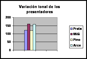 -En general, la media de duración de los grupos fónicos no resulta demasiado elevada, excepto en los casos de Ana Blanco -muy extensa- y Lorenzo Milá -demasiado breve-. El resto de los presentadores se mueven en valores intermedios. -En cuanto a la variación de los grupos fónicos, podemos concluir que es Roberto Arce el que varía más su discurso junto a Matías Prats. Frente a ellos, Lorenzo Milá es el presentador que más segmenta el mensaje, generando una sensación de hablar a golpes. -La mayoría de los presentadores emplean una velocidad de exposición bastante rápida y en valores similares. Pero encontramos que es Ana Blanco la presentadora cuya locución se percibe más acelerada (234 palabras por minuto). En el extremo contrario, Lorenzo Milá, Matías Prats e Hilario Pino son los presentadores que hablan a una velocidad más lenta (190 palabras por minuto). -Varios presentadores fragmentan, en ocasiones, estas unidades de sentido oral provocando rupturas lingüísticas en el discurso. Es Lorenzo Milá el presentador que más grupos fónicos rompen. El único presentador que ha mantenido, en todo momento, la unidad ha sido Matías Prats, con lo que podemos concluir que la fragmentación de su discurso es más lógica y se atiene a la norma lingüística. -La duración media de las pausas que emplean los presentadores de televisión es también bastante similar y escasa, excepto en el caso de Matías Prats, cuya duración es mayor. Por tanto, realiza pausas más perceptibles que las de sus otros compañeros. Sin embargo, las pausas de Ana Blanco son menos extensas que las de sus compañeros, lo que contribuye a percibir su locución como más acelerada. -Los presentadores de televisión realizan pocas pausas por segundo, aunque ahora es Angels Barceló quien obtiene los mejores resultados. Frente a ella, los presentadores que menos pausas utilizan son Roberto Arce y Ana Blanco, con lo que el telespectador tiene menos oportunidades de asimilar el discurso. En conjunto, atendiendo a todos estos valores, podemos concluir que es Matías Prats el presentador que reúne mejores condiciones: logra un ritmo muy adecuado para la locución respetando la norma lingüística pero produciendo variaciones en función del significado del mensaje. Su ritmo entonces se percibe fluido y natural. En el extremo contrario, y según estos datos, se encuentra Lorenzo Milá con un ritmo que se percibe bastante regular y entrecortado. Es, en cambio, Ana Blanco la locutora que más rápido habla. En niveles intermedios se encuentran el resto de los presentadores. |