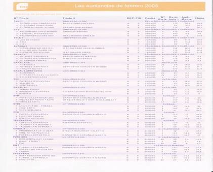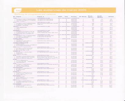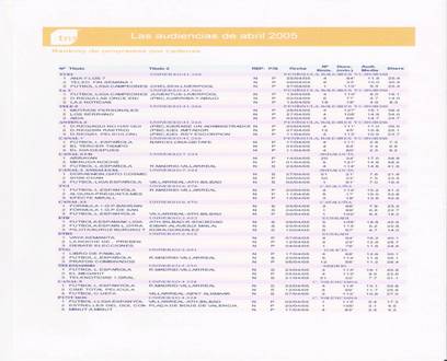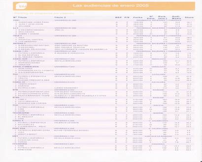 Programas más vistos cadenas ámbito nacional, enero 2005: TVE 1: Cuéntame cómo pasó. La 2: Bricomanía. Tele 5: AIDA. Antena 3: Aquí no hay quién viva. Programas más vistos cadenas ámbito nacional, febrero 2005: TVE 1: Fútbol liga de campeones. La 2: Balonmano campeonato del mundo. Tele 5:Los Serrano. Antena 3: Aquí no hay quién viva. Programas más vistos cadenas ámbito nacional, marzo 2005: TVE 1: Fútbol, liga de campeones. La 2: Fútbol liga de campeones. Tele 5: Los Serrano. Antena 3: Fútbol: clasificación mundial. Programas más vistos cadenas ámbito nacional, abril 2005: TVE 1: Ana y los 7. La 2: Fútbol liga de campeones. Tele 5: Motivos personales. Antena 3: Aquí no hay quién viva.
