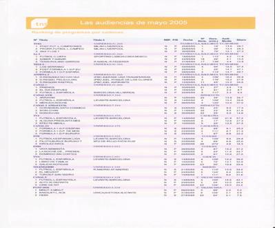 Programas más vistos cadenas ámbito nacional, mayo 2005: TVE 1: Fútbol, liga de campeones. La 2: Fútbol. UEFA. Tele 5: Los Serrano. |