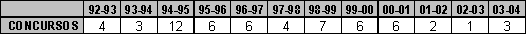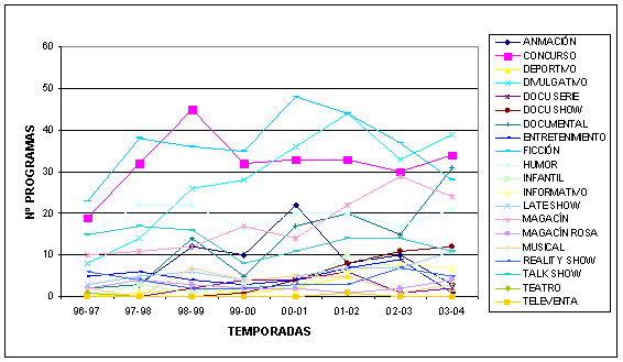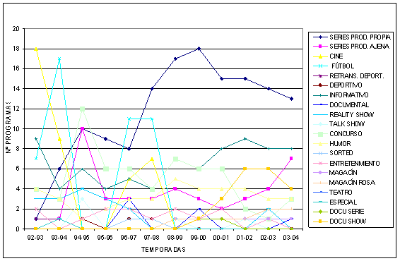 Fuente: Elaboración propia con datos de GECA 1. Desde 1992, cuatro géneros han liderado este ranking durante al menos una temporada: el cine, el fútbol, los concursos y las series de ficción nacional. 2. Desde la temporada 97-98, las series de producción propia destacan como el género que más aparece en el ranking de los 50 programas más vistos. 3. En la temporada 99-00, se produce un punto de inflexión y el número de series de producción propia decrece a favor de los docu-show, las series de producción ajena y los programas informativos. 4. En este mismo curso televisivo, irrumpe con fuerza el docu-show de la mano de Gran Hermano. 5. En la temporada 94-95, el concurso es el género que más puestos ostenta en el ranking de lo más visto debido al éxito de concursos-espectáculo emitidos en prime time como Qué apostamos de TVE 1. A partir de la siguiente temporada, se produce un descenso generalizado al ser desplazados los grandes formatos de entretenimiento de la franja de mayor audiencia por el éxito de las series nacionales –algunos de estos shows encontraron un hueco en la noche de los viernes y los sábados. En la 98-99, encontramos un repunte que se prolonga hasta la 00-01. Tras un nuevo retroceso, en la última temporada analizada, el concurso se recupera en términos de audiencia y también, como luego veremos, de producción. El número de concursos aparecidos en este listado por temporadas se recoge en la siguiente tabla: Tabla 1: Número de concursos entre los 50 programas más vistos (92-04)