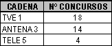 Fuente: Elaboración propia con datos de GECA A continuación, veremos qué concursos han aparecido en el ranking de los 50 programas más vistos: Tabla 2: Concursos más vistos (92-04)
