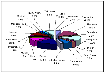 Fuente: Elaboración propia con datos de GECA 6. La media de concursos producidos por temporada es de 32,3, únicamente superada por la del género de ficción con 36,1 programas (incluye series, seriales y tv movies). 7. En el gráfico 7, se observa cómo el 15,7% del total del volumen de producción independiente corresponde al concurso. Entre la ficción, el concurso y el divulgativo suman el 47,2% del total de la producción independiente. Gráfico 7: Porcentaje de géneros producidos por la producción independiente (96-04)