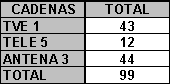 Fuente: Elaboración propia con datos de GECA 9. En la temporada 98-99, casi el 20% del tiempo dedicado a la producción independiente por todas las cadenas –nacionales y autonómicas- corresponde al concurso. 10. Se percibe en la temporada 03-04 una tendencia al alza del concurso, de la que ya hemos dejado constancia al analizar los programas más vistos y el volumen de producción independiente. 11. Como indica la tabla 8, atendiendo exclusivamente a las tres cadenas que son objeto de este estudio –TVE 1, Antena 3 y Tele 5-, el número de concursos producidos es de 99. Antena 3 destaca por ser la cadena que más ha apostado por el concurso y, más en concreto, por los de gran formato de prime time. Tele 5 es la cadena que cuenta con menos concursos de producción independiente. Tabla 8: Número total de concursos producidos para las cadenas (96-04)
