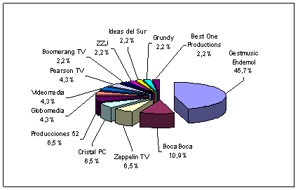 Fuente: Elaboración propia con datos de GECA 1. Trece productoras han producido concursos para Antena 3 desde 1996 2. Ocho de estas trece, además de concursos, han producido para esta cadena otros géneros: Gestmusic Endemol, Cristal PC, Globomedia, Boomerang TV, Videomedia, Producciones 52, Boca Boca y Zeppelin TV. 3. Antena 3 emite más concursos de producción independiente en la temporada 99-00. 4. Gestmusic Endemol, especializada en formatos de entretenimiento, destaca como la que más concursos ha producido con un total de 21 programas. En porcentajes, recogidos en el próximo gráfico, esta productora se ha encargado de la producción del 45,75% de los concursos de producción independiente de Antena 3. Gráfico 9: Productoras que han producido concursos para Antena 3: porcentajes (96-04)