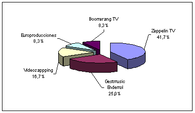 Fuente: Elaboración propia con datos de GECA 1. Cinco productoras han producido concursos para Tele 5 desde 1996. 2. Tres de estas cinco, además de concursos, han producido otros géneros: Gestmusic Endemol, Zeppelin TV y Europroducciones. 3. Tele 5 emite más concursos de producción independiente en la temporada 97-98. 4. Zeppelin TV destaca como la que más concursos ha producido con un total de 5 programas. En porcentajes, recogidos en el siguiente gráfico, esta productora se ha encargado de la producción del 41,7% de los concursos de producción independiente de Tele 5. Gráfico 10: Productoras que han producido concursos para Tele 5: porcentajes (96-04)