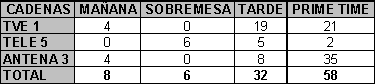 Fuente: Elaboración propia con datos de GECA 1. Antena 3 y TVE 1 programan los concursos, preferentemente, en prime time. Ello implica que, principalmente, producen concursos de gran formato (como El gran juego de la oca o Qué apostamos).