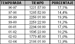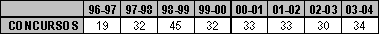 Fuente: Elaboración propia con datos de GECA 8. En la tabla que viene a cntinuación, referida al tiempo de emisión por temporadas de los concursos de producción independiente, se aprecia cómo durante la segunda mitad de la década de los 90, el número de horas de emisión de concursos se incremente progresivamente hasta la temporada 99-00, en la que se alcanzan las 2.258 h 22' .Esta cifra supuso el 17% del volumen de tiempo producido por las productoras independientes durante el mencionado curso televisivo. Tabla 7: Tiempo de emisión de concursos de producción independiente (96-04)