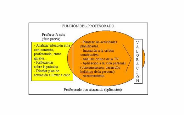 (Ver cuadro 2) Como se refleja en el cuadro dos, el papel del profesor o la profesora es irremplazable ya que será quien guíe la actividad y quien servirá de apoyo ante las dudas o clarificar conjuntamente los problemas de comprensión de la actividad o de ciertos mensajes televisivos. En un primer momento vemos la fase donde el profesor o la profesora planifica fuera de aula lo que desea realizar. Es un buen momento que trabaje si lo desea con otros profesores o profesoras y/o con el pedagogo/a del centro; des esta manera se formará un equipo más o menos multidisciplinar y quizás se enriquezca lo que se vaya a programas o incluso resolver dudas que puedan aparecer. En segundo lugar el profesorado además de dar unas líneas de trabajo al alumnado, servirá de permanente apoyo y asesoramiento al alumnado y de incitar a la crítica constructiva y educativa de los mensajes televisivos. Si se ha colaborado con otros miembros del centro, es interesante que haya momentos en que todos y todas expongan lo que se está realizando o bien trabajen conjuntamente. Por otro lado, reforzar la idea de la necesidad de innovación por parte del profesorado para llevar a cabo actividades que tengan la finalidad que perseguimos y por ello,hablaríamos de momentos inéditos que se hacen posibles en nuestras prácticas como docentes; es la única manera de llevar al aula la televisión, trabajando con otras claves y otras actividades que hagan de la enseñanza y el aprendizaje momentos profundos de desarrollo personal pero agradables. Cuando hablamos de momentos inéditos en las prácticas educativas, retomamos la filosofía del inédito viable de Paulo Freire, donde el autor propine que el educador sea quien encuentra la manera que llegue la educación a las personas con las que colabora, a través de la pretensión de conseguir una mejora o desarrollo y poniendo en prácticas pensamientos que nunca se han llevado a cabo pero que pueden ser real, es decir, a través de llevar a cabo unas prácticas o una planificación inédita se podrá conseguir nuestras pretensiones aún cambiando lo que ocurre normalmente. |